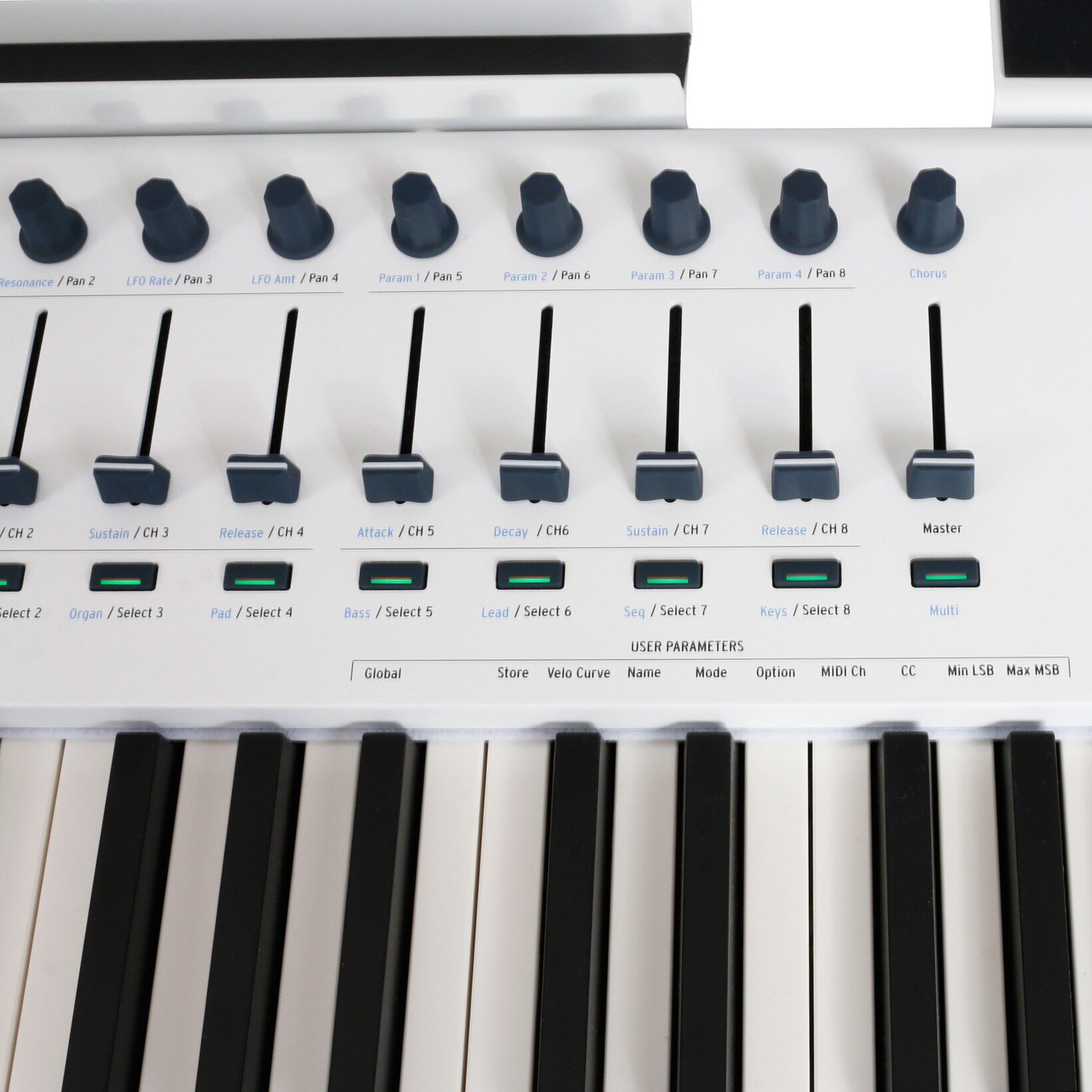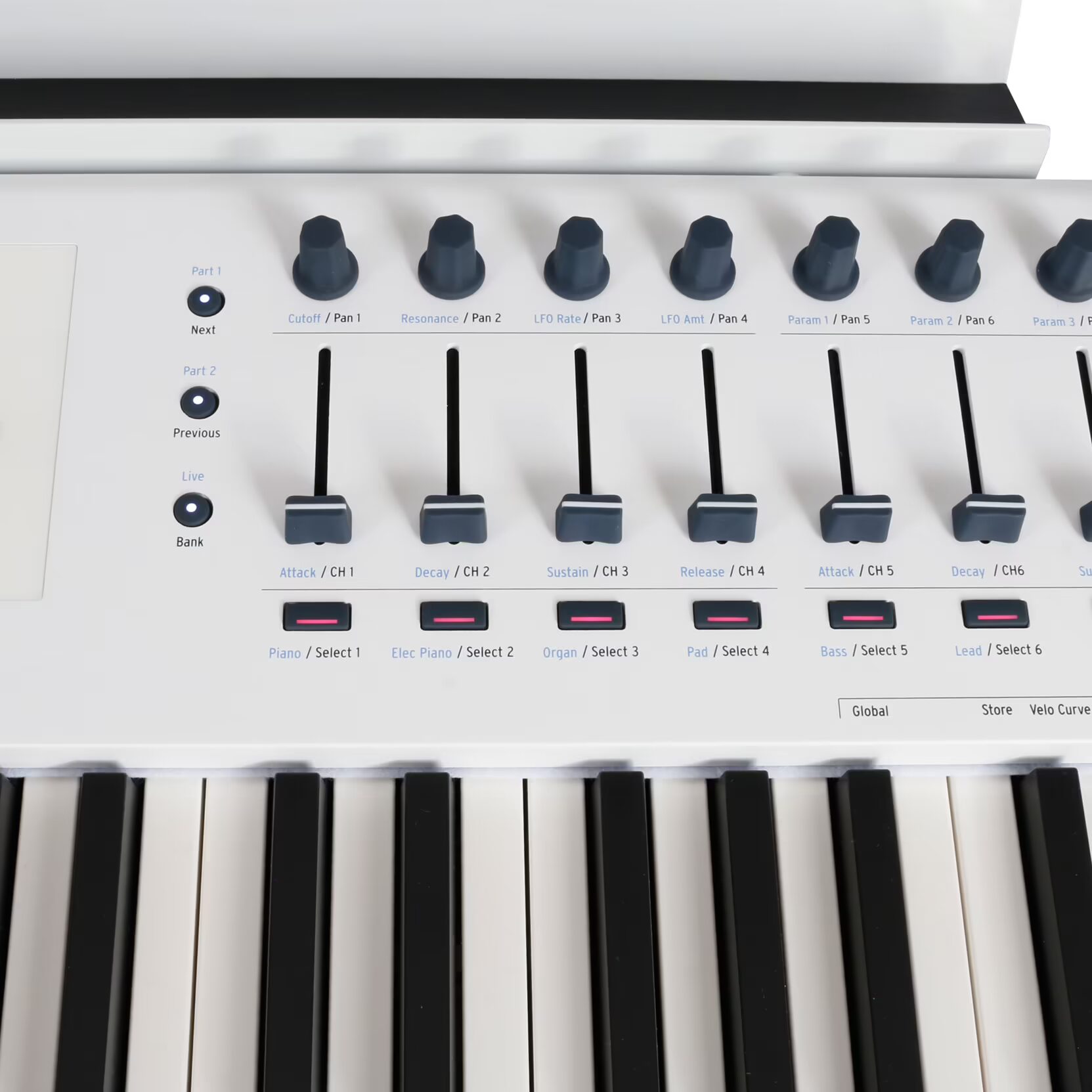 Functions fader(s), encoder(s), master section / transport, multi-coloured backlit buttons / pads, sustain pedal port, expression pedal port