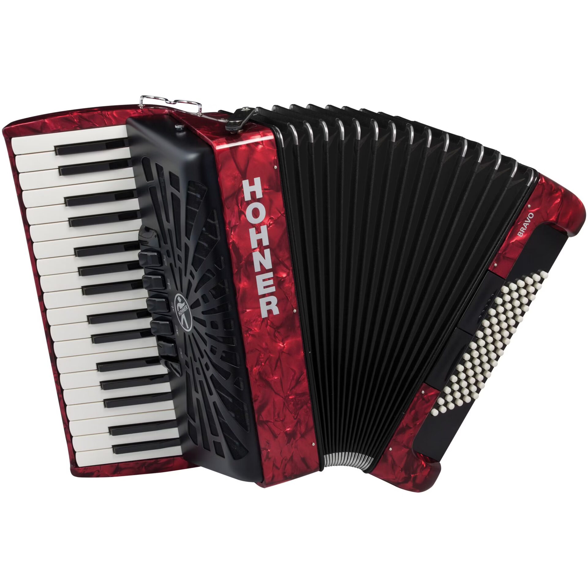 You’re given access to five registers on the keyboard side that let you expand the musical range by a full octave or combine timbres for a rich and impressive sound. The button that displays two, vertically placed dots (16/8′) houses a characteristically Argentinian sound, while the button with the two horizontally placed dots (8/8′) summons the romantic sound of Paris. The sound of the bass buttons can be varied as well, from heavy bass to subtle accompaniments, making the Hohner Bravo III a highly versatile instrument that can be used solo, as a backing instrument or as part of a fully-fledged band.