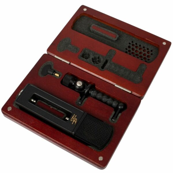 comes packed in a wooden box including shockmount, thumb screw, warranty and manual