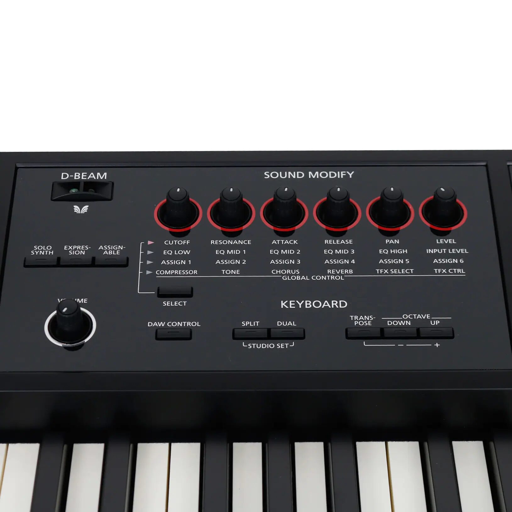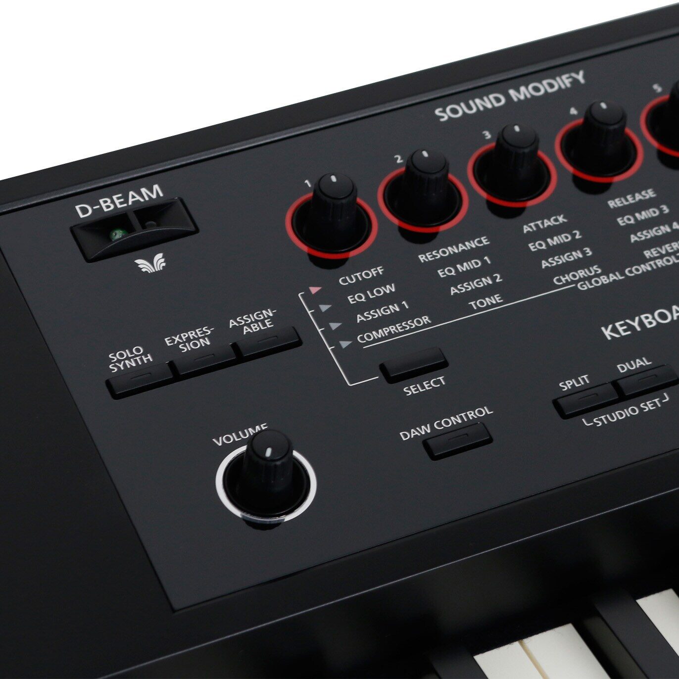 The FA-08 bypasses the indirect interaction that used to be the standard for workstations. The six knobs of the Sound Modify section give you control over ADSR curves, EQ, effects and more. The 16 illuminated pads can be used to trigger, among others things, the built-in sampler. With the DAW Control button you can seamlessly control your DAW, while the familiar D-Beam controller does not require any further explanation. The FA-08 can also be used as a USB audio interface. The rear panel is fitted with inputs for line signals (mini jack) and guitar or vocals (jack), so you only need to add a computer or a laptop to create a full-fledged digital studio environment.