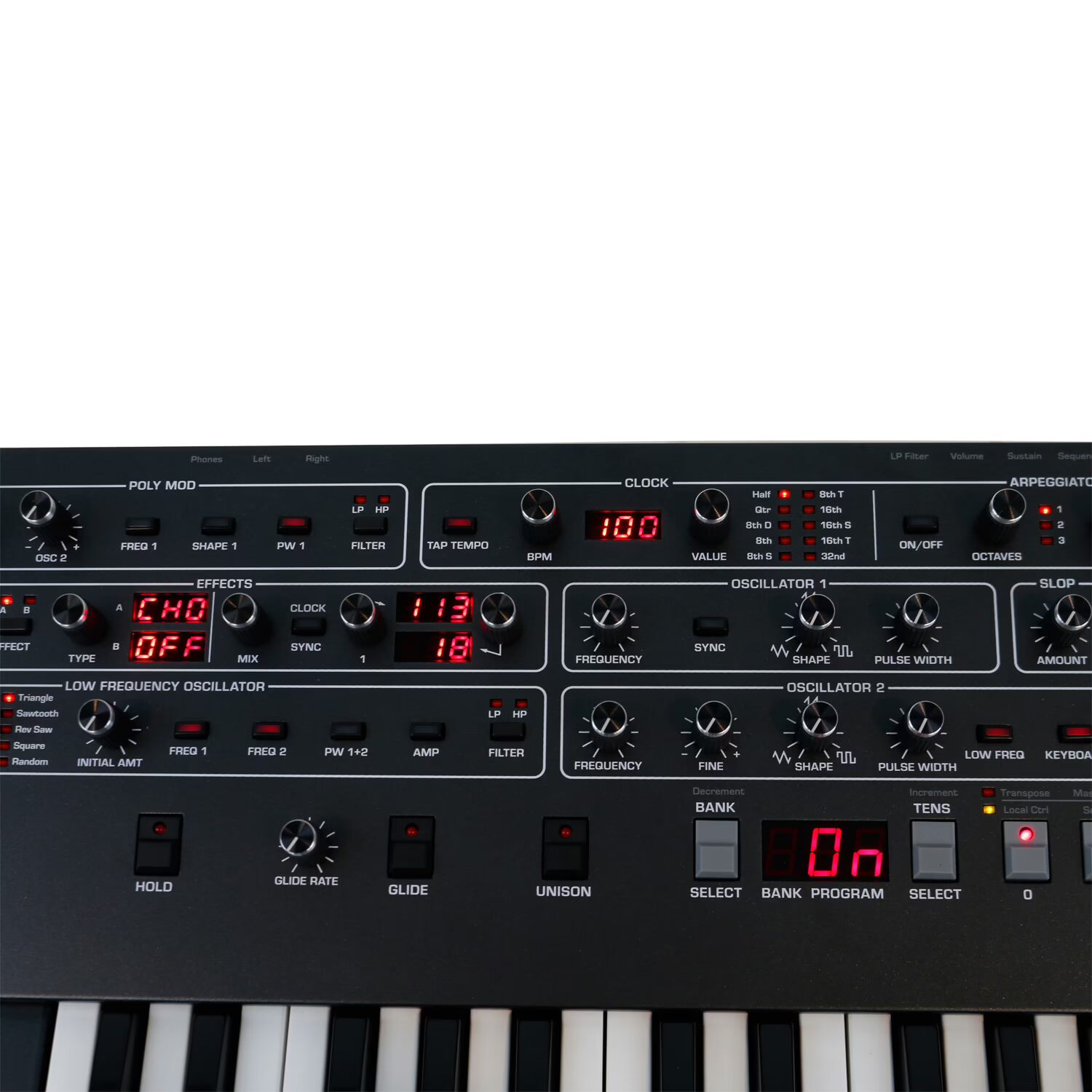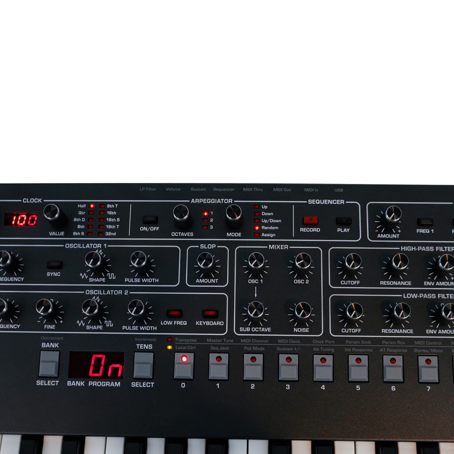 In its core, this is a very accessible 6-voice synthesizer, with two oscillators per voice, augmented by a sub-octave oscillator and a white noise oscillator. The classic wave shapes, including sawtooth, square wave, triangle, pulse, and hard-sync ensure the necessary sound variation. Besides a 24 dB low-pass filter, this synth also has a 12 dB high-pass filter and 49 semi-weighted touch-sensitive keys with after touch that feel amazing!