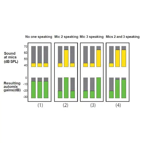 automatically adjusts microphone gain (louder for active mics, softer for inactive mics)
